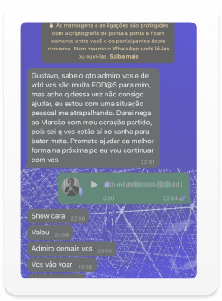 Você receberá mais de 70 aulas completas mostrando o passo a passo na tela do meu computador. Além de um suporte personalizado comigo e com minha equipe para tirar toda e qualquer dúvida.